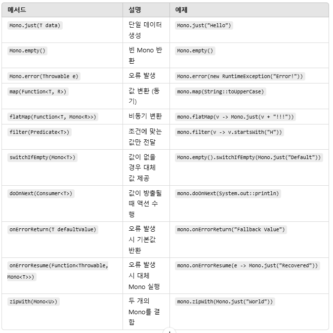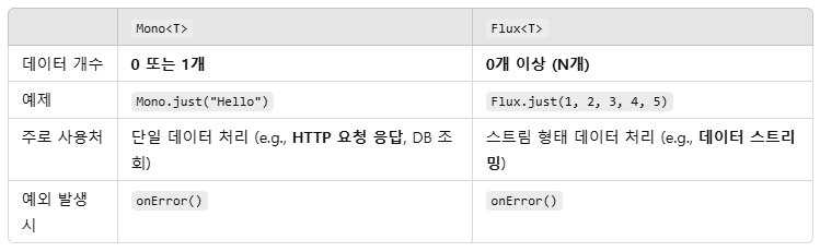 `Mono<T>`와 `Flux<T>`는 Spring WebFlux에서 리액티브 스트림을 다룰 때 사용되는 기본적인 타입이며, 다양한 연산자를 제공합니다
