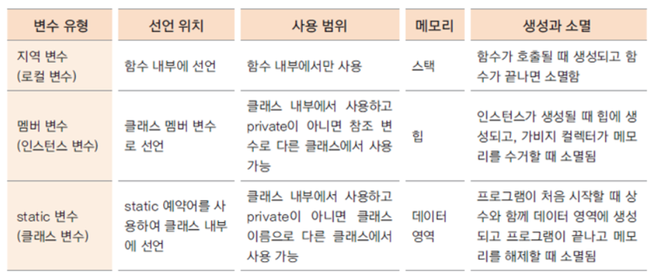 - 지역변수, 멤버 변수, 클래스 변수는 유효범위와 life cycle, 사용하는 메모리도 다름
