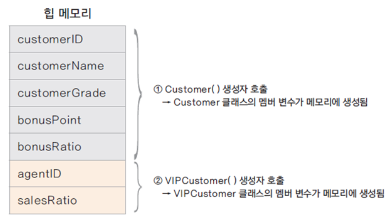 VIPCustomer() 생성자에 의해 VIPCustomer 클래스의 모든 멤버 변수에 대한 메모리는 생성되었지만,