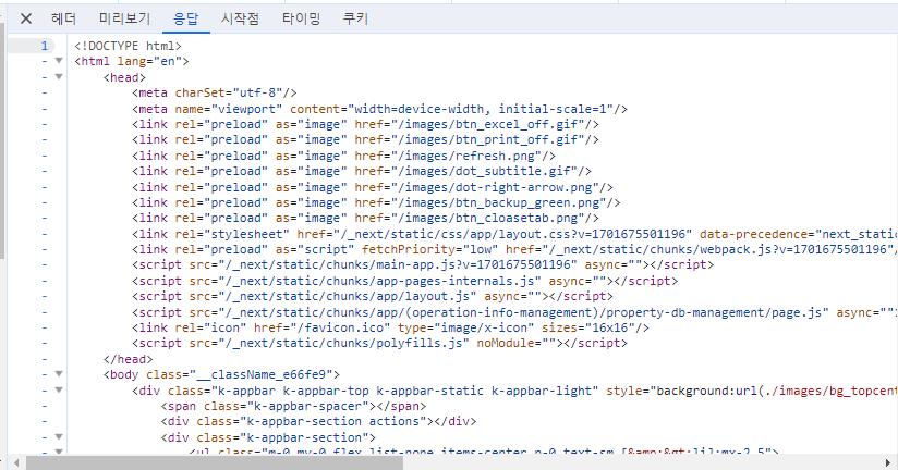 - SSR 또는 SSG에서는 서버에서 미리 HTML 페이지를 생성한 후 이를 클라이언트에 전달합니다. 이 HTML은 실제 페이지 구조를 포함하고 있지만, JavaScript 로직은 포함되어 있지 않습니다.