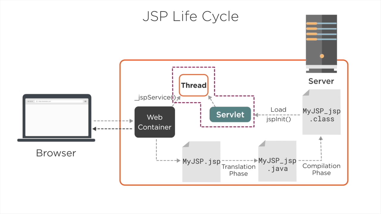 - JSP 컨테이너는 JSP 파일을 서블릿 파일로 변환합니다. 변환된 서블릿은 Java 컴파일러에 의해 컴파일되어 클래스 파일(.class)로 생성됩니다.